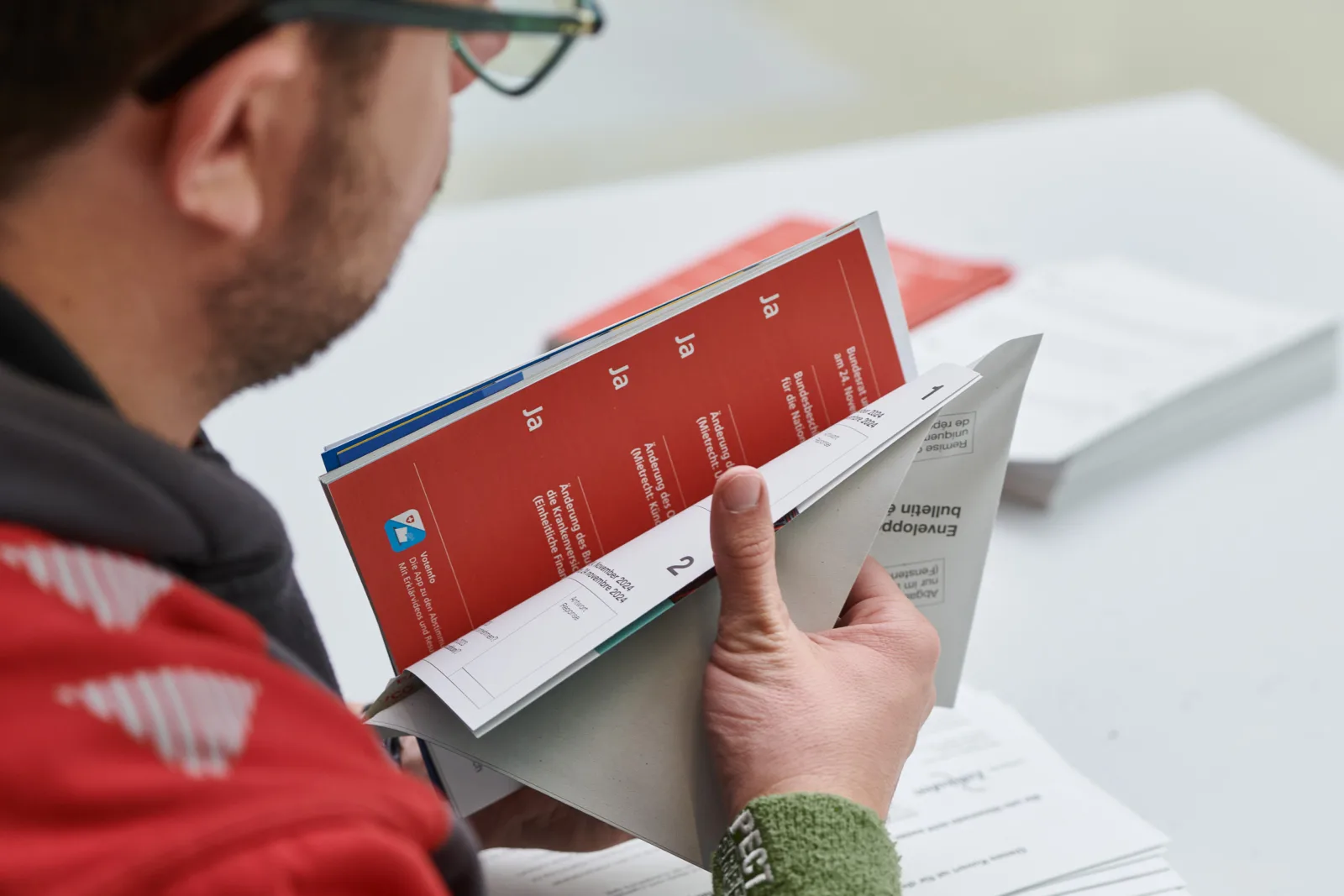 Zuerst treffen die amtlichen Unterlagen wie Erläuterungen, Stimmzettel etc. von Bund, Kanton und Gemeinde ein. Anschliessend folgen die Stimmrechtsausweise und Couverts der Gemeinden. Sobald das gesamte Material vorliegt, wird die Reihenfolge der Beilagen bestimmt: Der Stimmrechtsausweis liegt dabei generell zuoberst, gefolgt von Informationsmaterial der drei Ebenen des Staats, wobei das graue Stimmcouvert den Abschluss bildet.